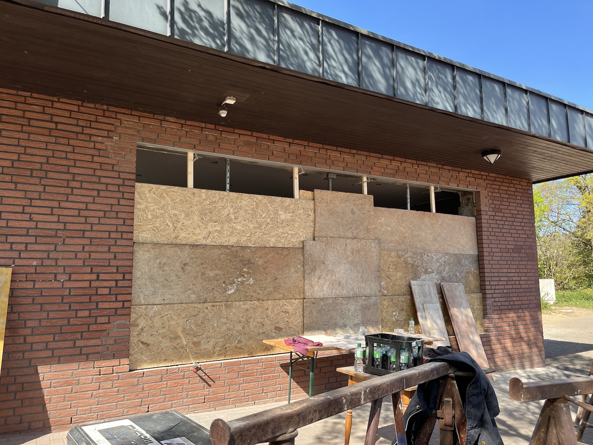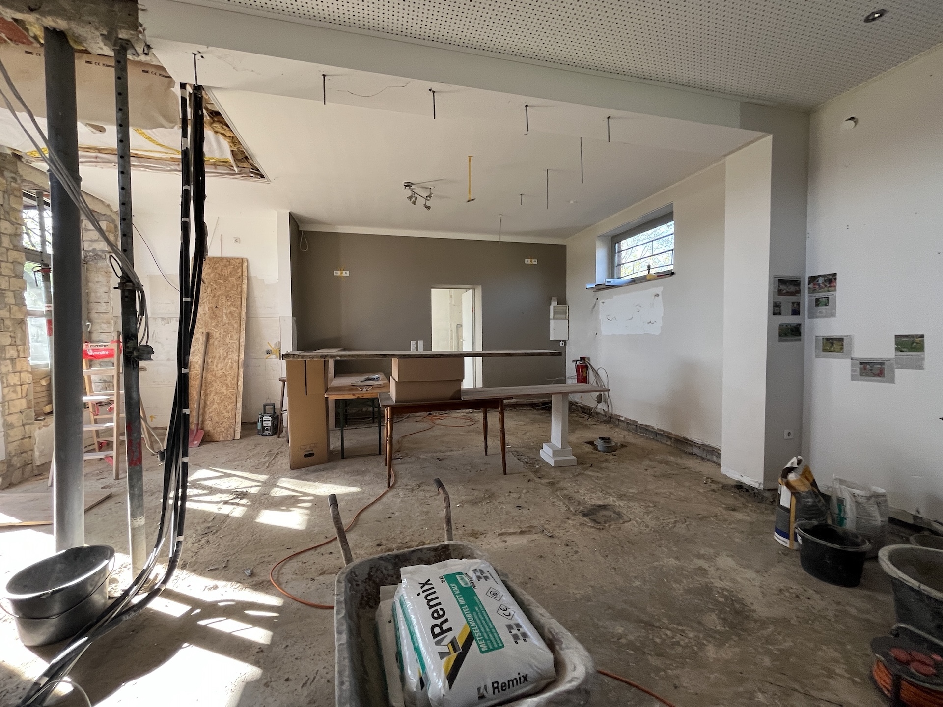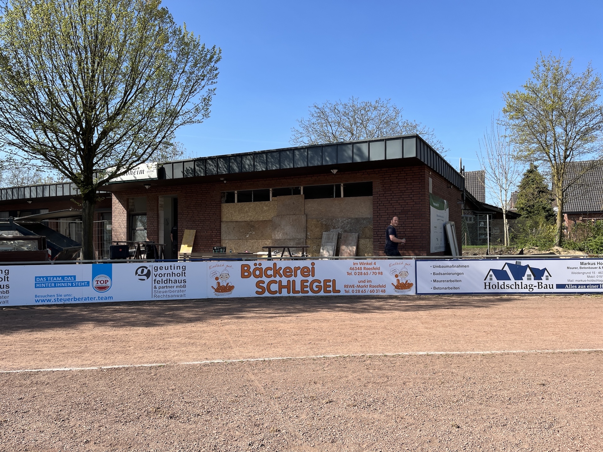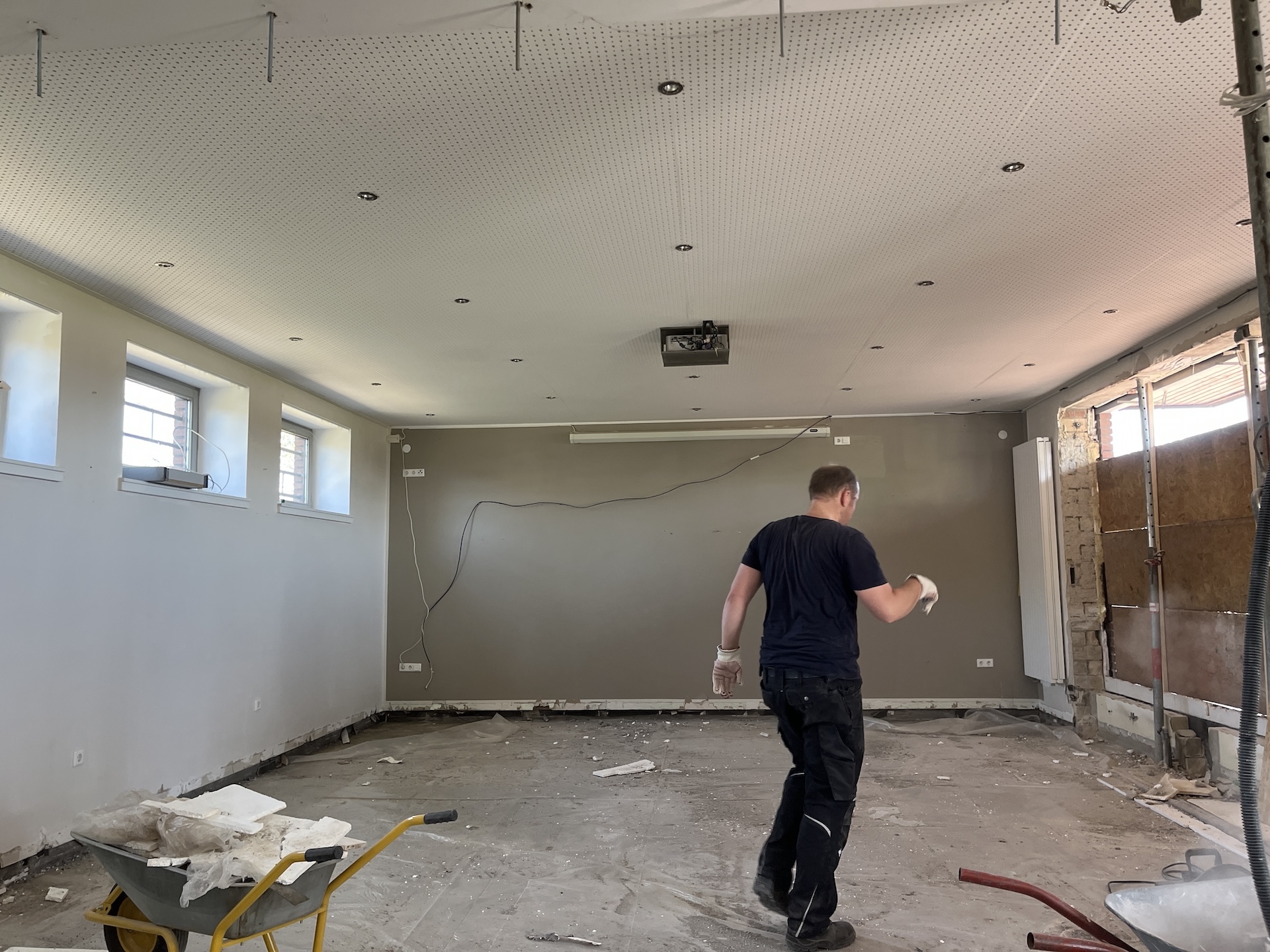 Was Ende März 2025 begann, sollte Ende August fertig sein. Einige unvorhersehbare Ereignisse sorgten allerdings dafür, dass das Vereinsheim verspätet am 02.11. offiziell eröffnet werden konnte. Die Planung wurde vom Architekten Mischo aus Borken übernommen, die Bauleitung und Umbau nahm der Verein selbst in die Hand. War anfangs die energetische Modernisierung der Fenster sowie die Überarbeitung des Eingangsbereiches geplant, entpuppte sich letzteres relativ früh als Überraschung: bei der Entfernung des Windfangs zur Vergrößerung der nutzbaren Fläche, entpuppte sich ein als selbsttragend verzeichneter Unterzug zur Aussteifung des Gebäudes als nicht selbsttragend. Er war für die Verlegung des Fallrohres der Dachentwässerung einfach durchbohrt worden. Es folgten Risse im Estrich, eine fehlende Dampfsperre, eine zwingend zu ersetzende Elektro-Unterverteilung, fehlende Wasserleitungen u.v.m.