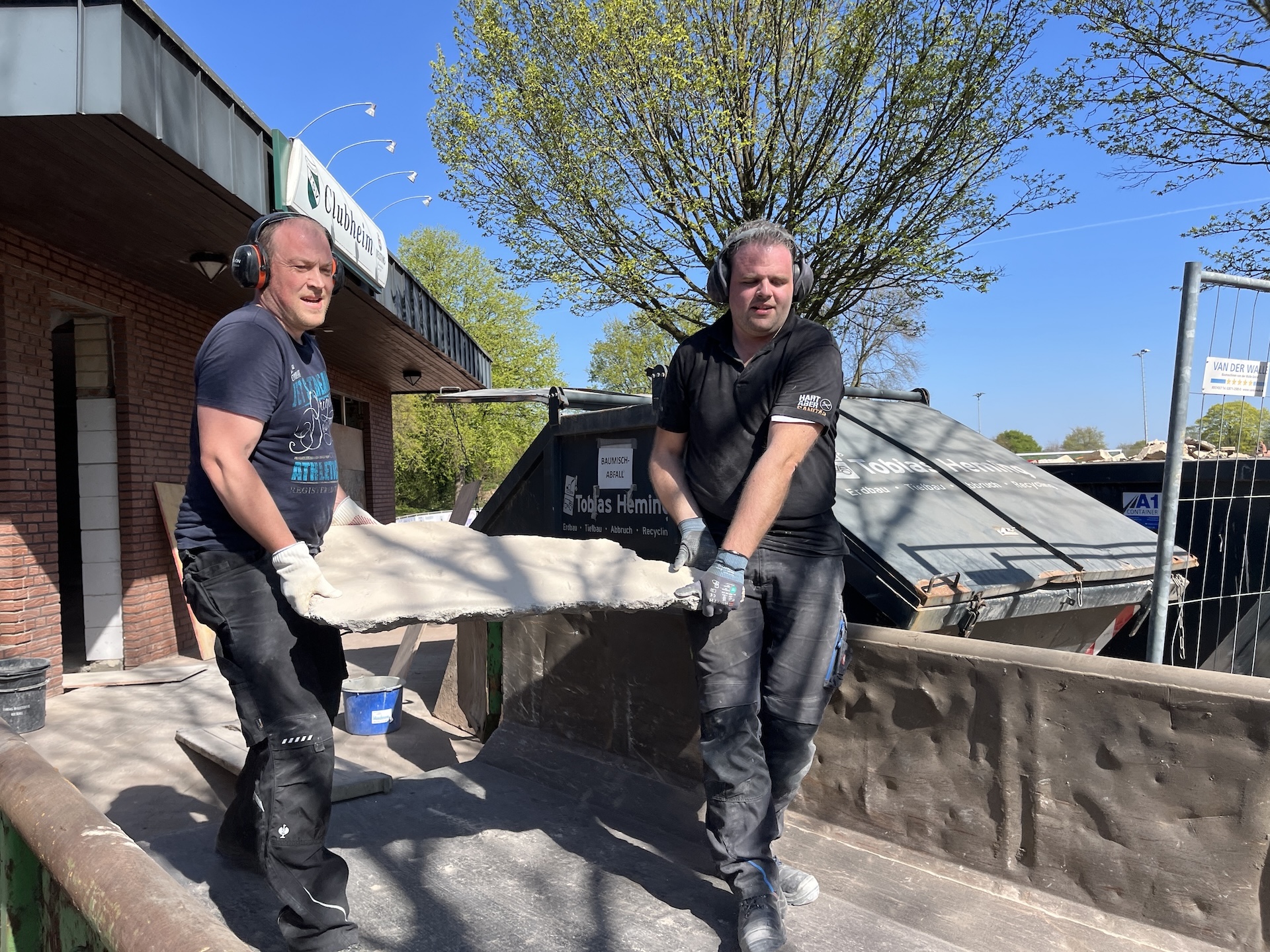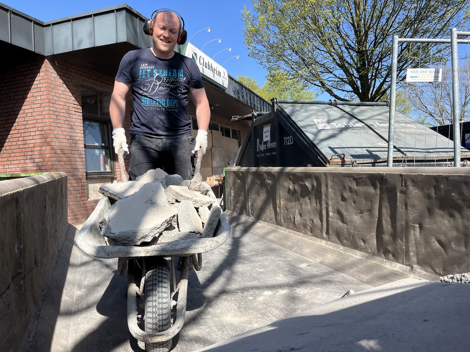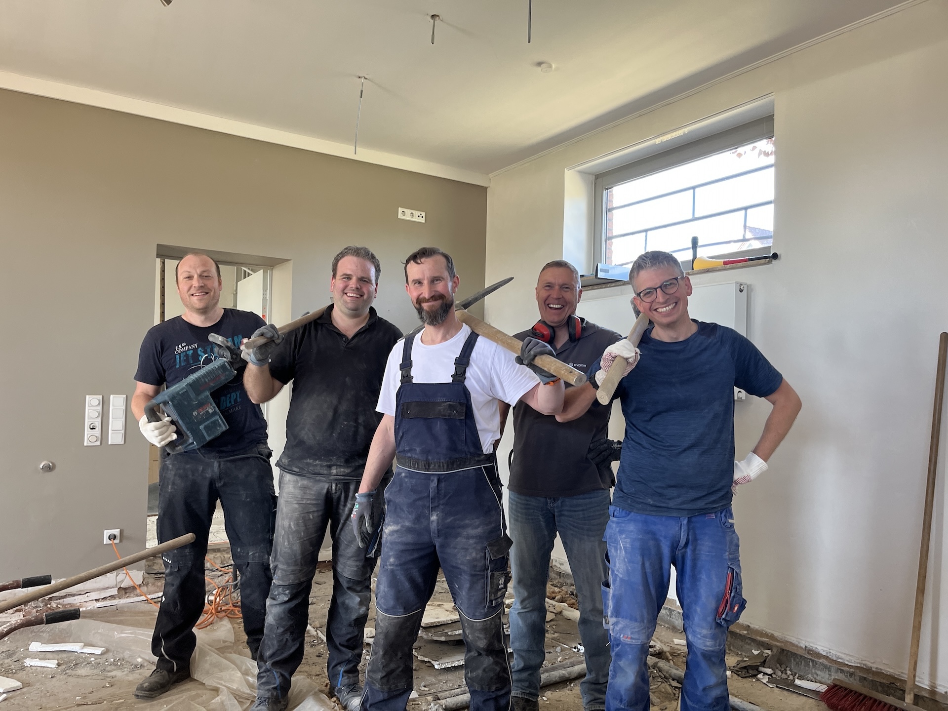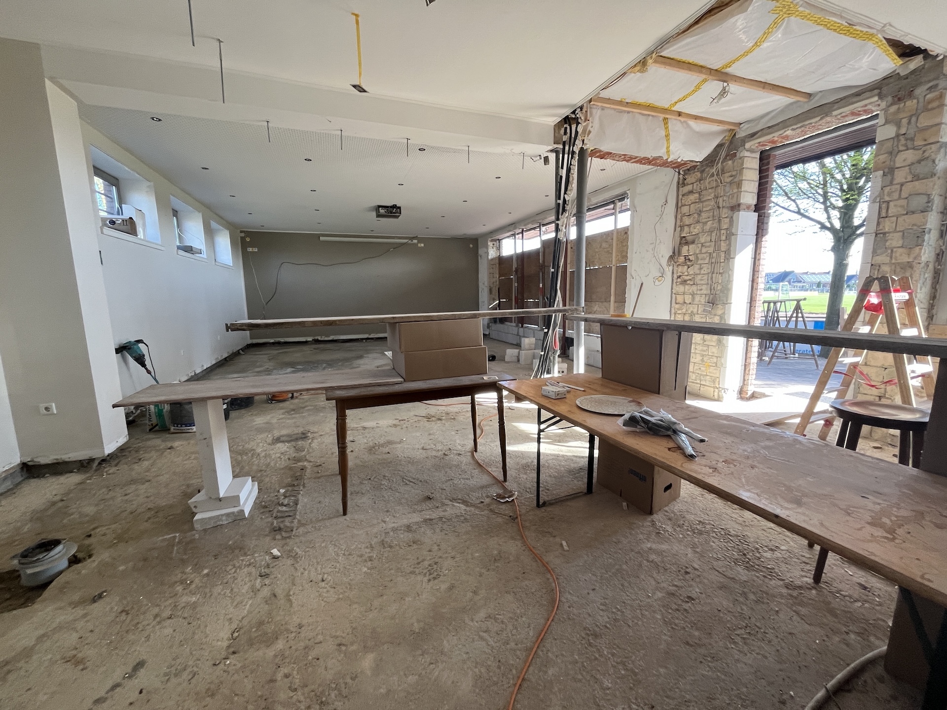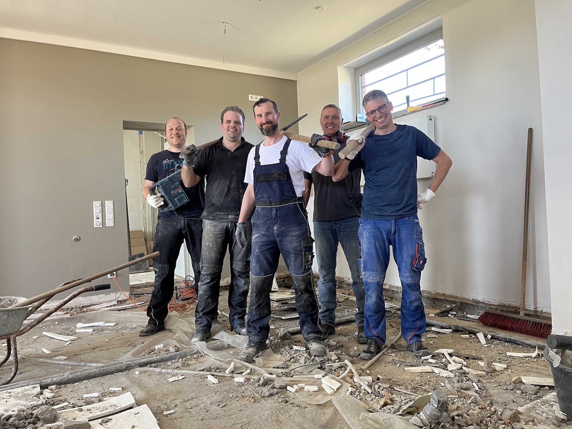 Was Ende März 2025 begann, sollte Ende August fertig sein. Einige unvorhersehbare Ereignisse sorgten allerdings dafür, dass das Vereinsheim verspätet am 02.11. offiziell eröffnet werden konnte. Die Planung wurde vom Architekten Mischo aus Borken übernommen, die Bauleitung und Umbau nahm der Verein selbst in die Hand. War anfangs die energetische Modernisierung der Fenster sowie die Überarbeitung des Eingangsbereiches geplant, entpuppte sich letzteres relativ früh als Überraschung: bei der Entfernung des Windfangs zur Vergrößerung der nutzbaren Fläche, entpuppte sich ein als selbsttragend verzeichneter Unterzug zur Aussteifung des Gebäudes als nicht selbsttragend. Er war für die Verlegung des Fallrohres der Dachentwässerung einfach durchbohrt worden. Es folgten Risse im Estrich, eine fehlende Dampfsperre, eine zwingend zu ersetzende Elektro-Unterverteilung, fehlende Wasserleitungen u.v.m.